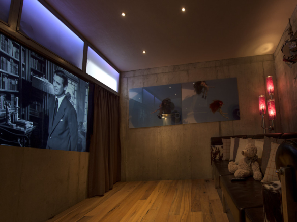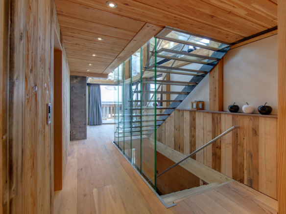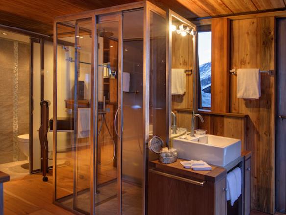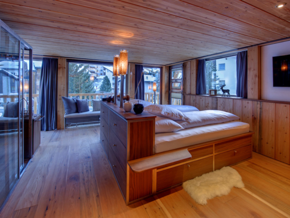 The bedrooms are spread over two storeys below. Right down in the cellar, the luxury chalet in addition has a small private home cinema and games room and is equipped with a workstation, toilet and shower. Next door is the ski room with heated ski boot racks. All these rooms have access to a private lift.