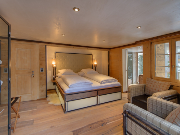 This extension has been constructed exclusively from local larch and designed to include large areas of glass, providing a spectacular 360-degree panoramic view over the village and the Matterhorn. The chalet has 5 double bedrooms, one of them containing a high sleeper and thus an extra bed, making it ideal for an additional child. The roof structure has open gables, and provides an open living, dining and kitchen space, with the fireplace giving the place a cozy atmosphere.