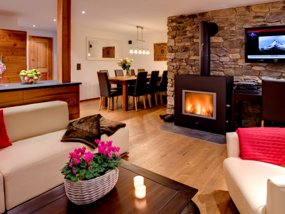 The chalet has tasteful decoration, delicately combining an alpine, cosy and contemporary finish, with liberal use of wood and stone. It has all the latest technology with flat-screen TVs, more than a hundred satellite channels, a fireplace and geothermal heating to reduce the chalet’s carbon foot-print.