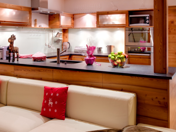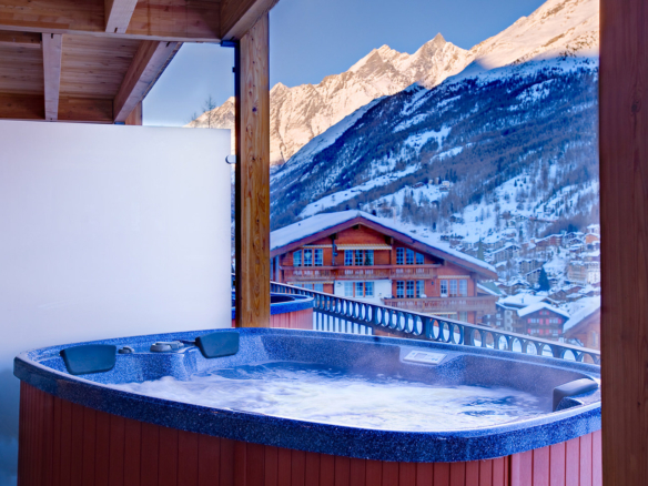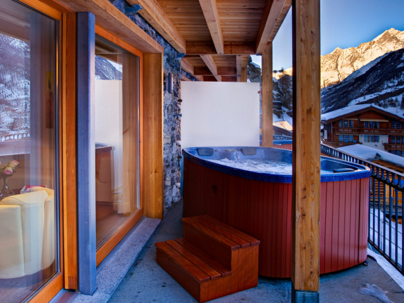 On the ground floor you have the sitting room and an open-plan kitchen with the dining table, both giving access to the terrace through French windows. There the chalet enjoys the use of its own unique private outdoor hot-tub surrounded by snow in the winter, and alpine meadows in the summer – perfect to relax and enjoy the view (or the stars) after a long day in the mountains.
