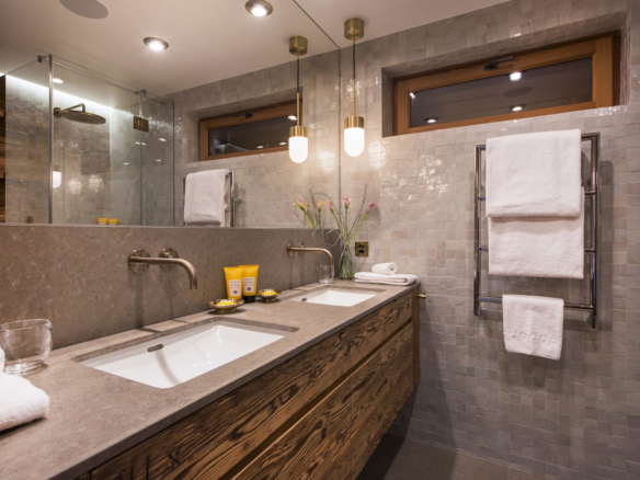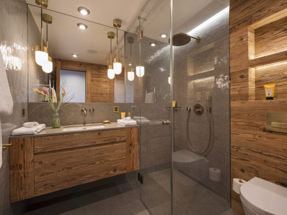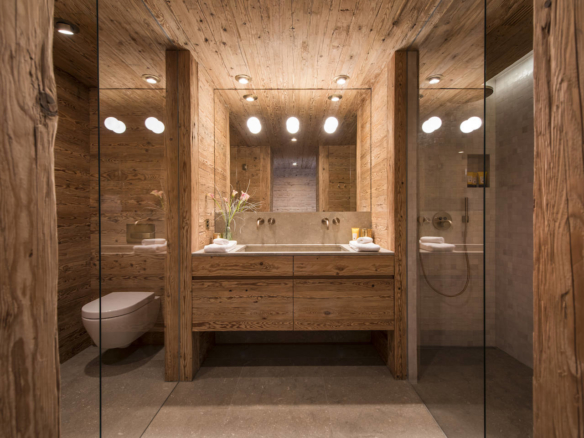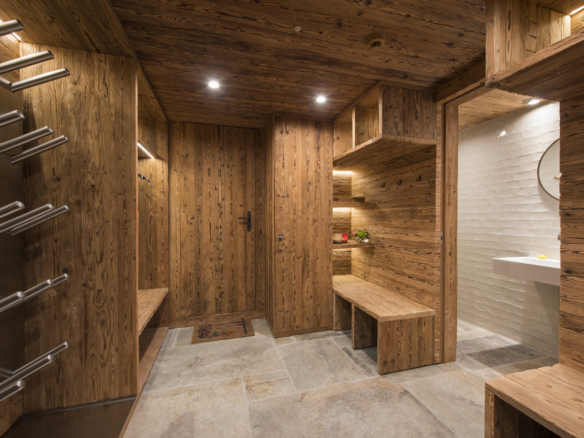 From the central living area of the impressive 7 Heaven’s building you enter the chalet onto the ground floor which is home to the private ski room with guest restroom. Here there is a lift which runs through the property.