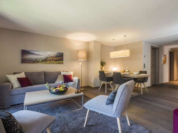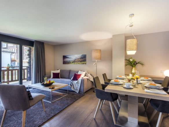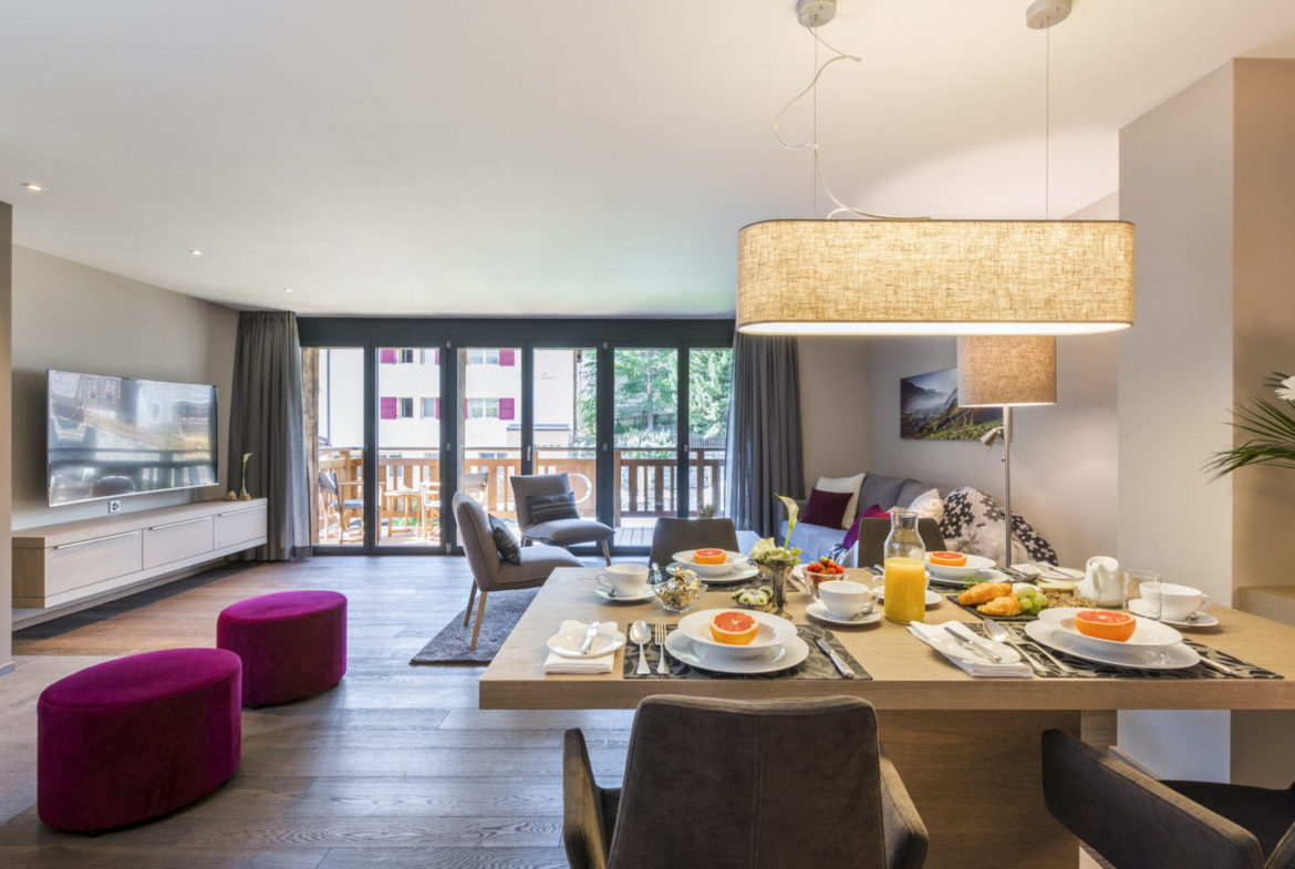Light floods into the apartment through the floor to ceiling glass doors. They open out onto the south-facing balcony which looks out to the magnificent Matterhorn.