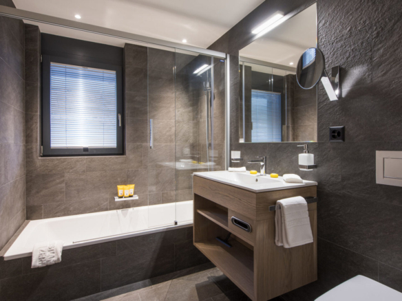 This luxury apartment is perfect for a small family wanting to relax and unwind in style. Set over one floor, you enter the apartment into the main hallway. From here you can access the two spacious bedrooms. Both bedrooms have beautiful terraces which have spectacular views, flat screen TV’s, desks, and safes. The bedrooms can be made up as twins or doubles making it ideal for a family or group of friends. One bedroom has a private bathroom and the other a private shower room.