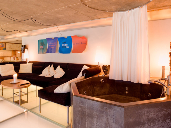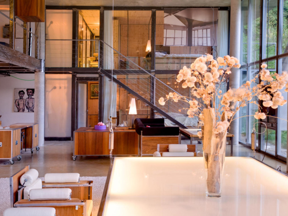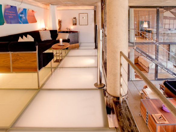 The main loft living area has a suspended and illuminated table which can be raised and lowered from coffee table, to dining table, to ceiling height; the latter creating a large party space!