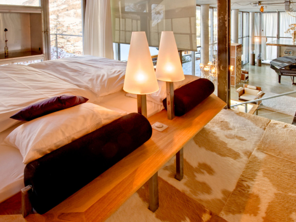 In one corner you can play on a baby grand Steinway piano, while in another you can sink into a large sofa and gaze simultaneously at the stunning view over Zermatt and at the crackling fireplace set into the glass wall.
