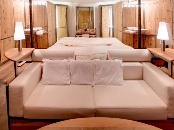 The sense of space, light and closeness to nature that the Loft provides is unparalleled: there are no barriers between the nature outside and the home space inside – all is fluid and free. On the two sides overlooking Zermatt, the walls consist of floor to ceiling glass, with French windows 6 metres high leading to a large terrace. (There is a white electric exterior curtain that can wrap itself around all that glass if need be). The ceiling is supported by seven columns, while the glass walls have an inset fireplace and three alcoves.