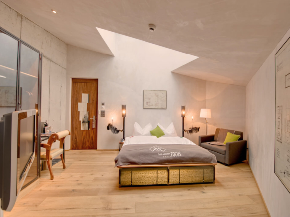The asymmetrical, expansive skylight is the highlight of these 20-25 sq m double rooms. From your bed, you look straight out into the Valais skies. Roof windows provide the day light as there are no windows are on the side walls – a unique feature! There is no balcony. Occupancy depends on the room, with 2-4 persons being an option.