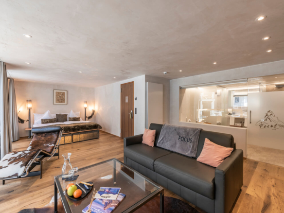Float in large rooms above Zermatt! Treat yourself to a stay in one of the penthouse suites with unique fireplaces. The largest, the Focus Suite, at 70 sq m has glass walls dividing sleeping and living areas, here you can live like royalty! The 50 sq m Matterhorn or Dom Suites, where from the free standing bathtub, your balcony or terrace, you will always see the Matterhorn in view. All suites have a bathroom with showeer. Occupancy max. 4-5 persons.