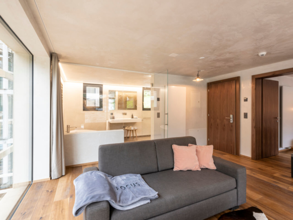The Junior Suite impresses with its spacious rooms and large mirrored windows. Terrace with side view to the famous Matterhorn. The bedroom with a stylishly illuminated bedstead is open to the cosy living room. The spacious bathroom with freestanding bathtub and rain shower invites you to relax. Occupancy max. 4 persons utilizing the large sofa bed in the living area.