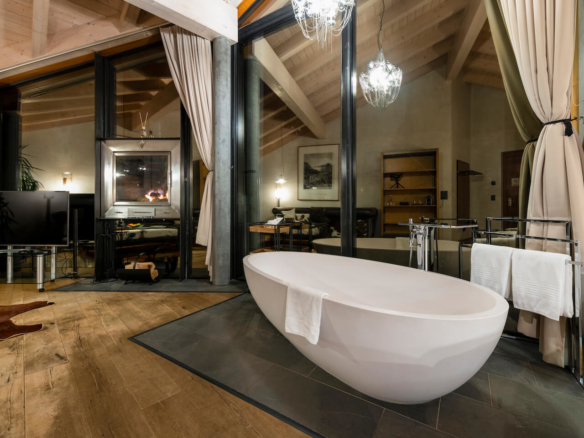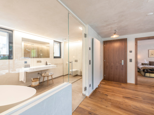 Drift away from the daily routine in the large 50 sq m Suite 50. The bedroom with stylishly lit bed frame is separated from the generous living room by a glass wall. From the free standing bathtub, you can enjoy views of the Matterhorn and the mountain scape thanks to the wide glass facades. Occupancy max. 4 persons utilizing the large sofa bed in the living area.