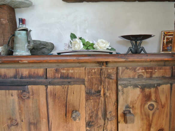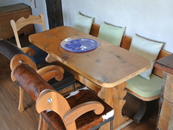 The dining area features a rustic wood table and comfortable chairs. The Mountain Cottage is heated through solar panels and additionally, there is a fireplace (wood included) which delivers special charm to mountain life.