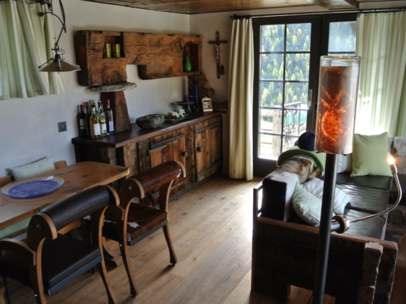 On the entrance level, you will find the living room and kitchen. In the sofa corner, uniquely built from aged wood, leather and cow hide, there is a satellite TV for your use. The direct view of the Matterhorn provides you with the ultimate calming effect after a long day outdoors.