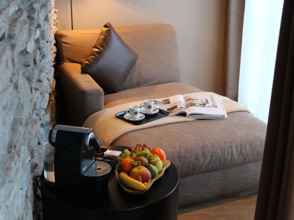 The Matterhorn suite has a shower and bath, with toilet. The king size bed with mattress topper can be separated to make 2 single beds. There is also a separate room with 2 single beds or table. Within the suite you will have a Nespresso coffee machine, Bose home speaker 500 with radio, wifi and bluetooth connection, bathrobes, slippers.