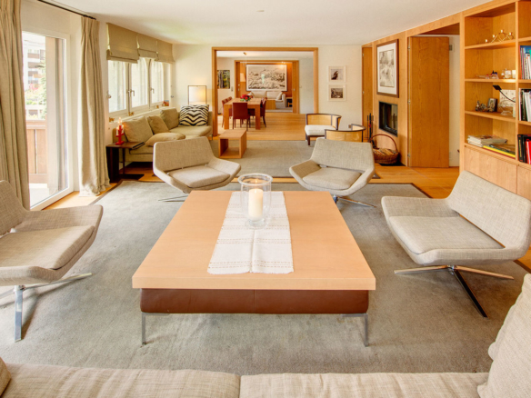 The third floor apartment is absolutely vast with 315 sqm of space and perfectly situated in what is quite simply the best location in Zermatt: in the heart of the village, next to the ice skating rinks (tennis courts in the summer), 1 minute away from the main shopping centre and 2 minutes away from the Gornergrat mountain railway.